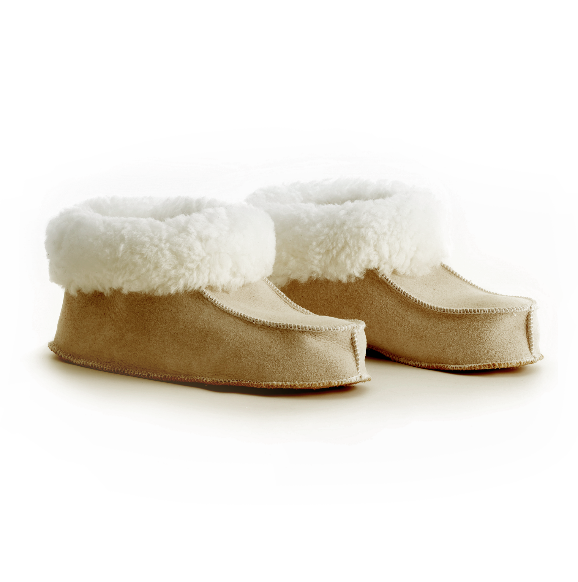 Vår klassiska modell är tillverkad av mjukt fårskinn och har en tjock, mysig krage. Varje par tillverkas för hand i vår verkstad av förstklassigt fårskinn.